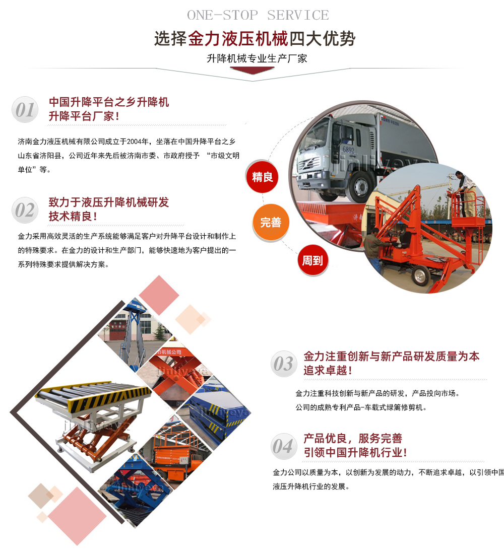 濟(jì)南金力液壓機(jī)械有限公司是濟(jì)南市高新技術(shù)企業(yè),質(zhì)量、信譽(yù)雙保示范單位,重合同守信用單位。工廠(chǎng)始建于1958年,于2004年改制,占地面積12萬(wàn)平方米,建筑面積8萬(wàn)平方米,本公司生產(chǎn)設(shè)備精良,工藝先進(jìn),檢測(cè)手段齊全,技術(shù)力量雄厚,是國(guó)內(nèi)液壓升降平臺(tái)專(zhuān)業(yè)生產(chǎn)廠(chǎng)家。 本公司已通過(guò)了ISO國(guó)際質(zhì)量管理體系認(rèn)證…